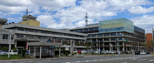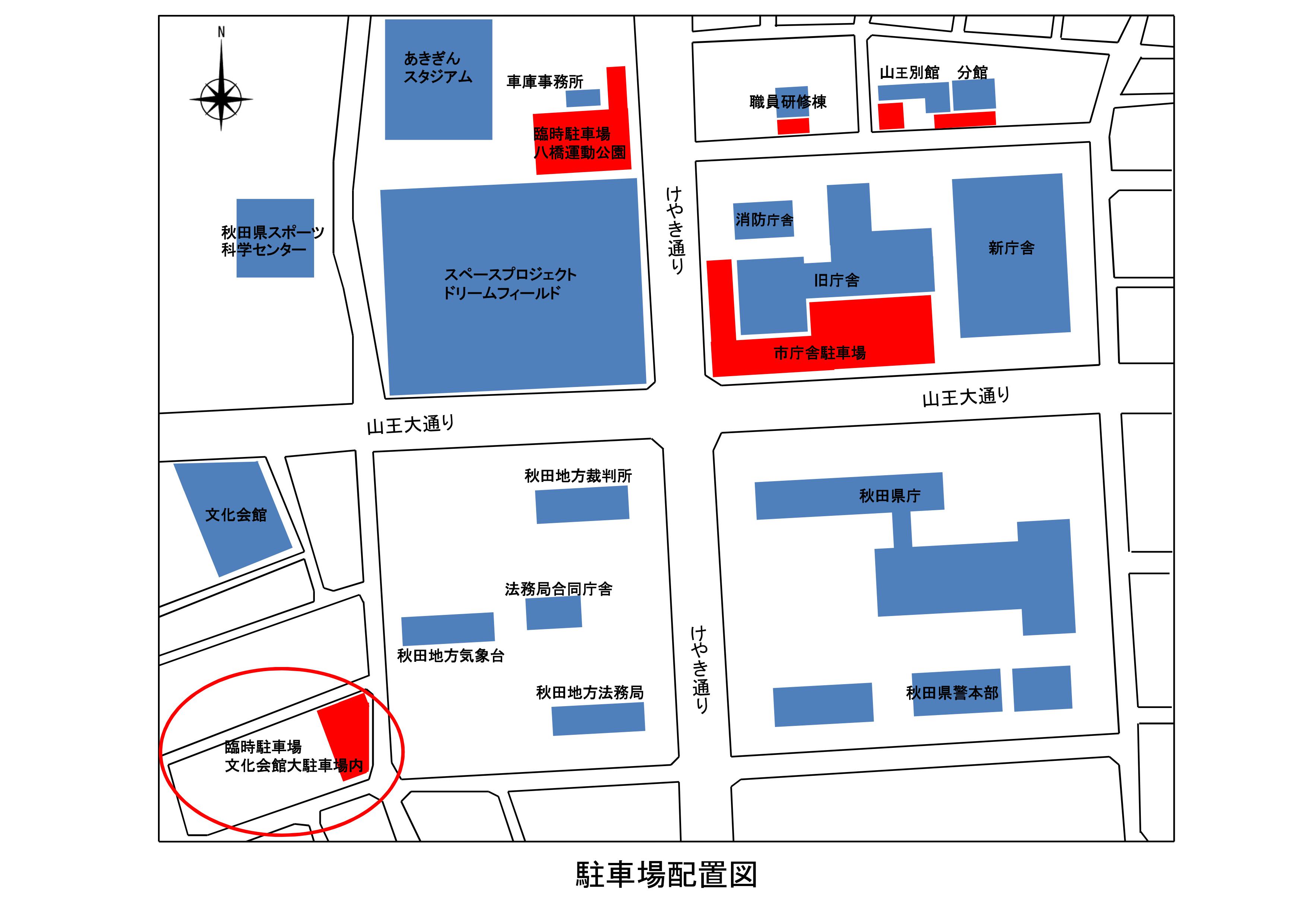 ■駐車場:市役所新庁舎の駐車場または臨時駐車場 「図の赤いところです」